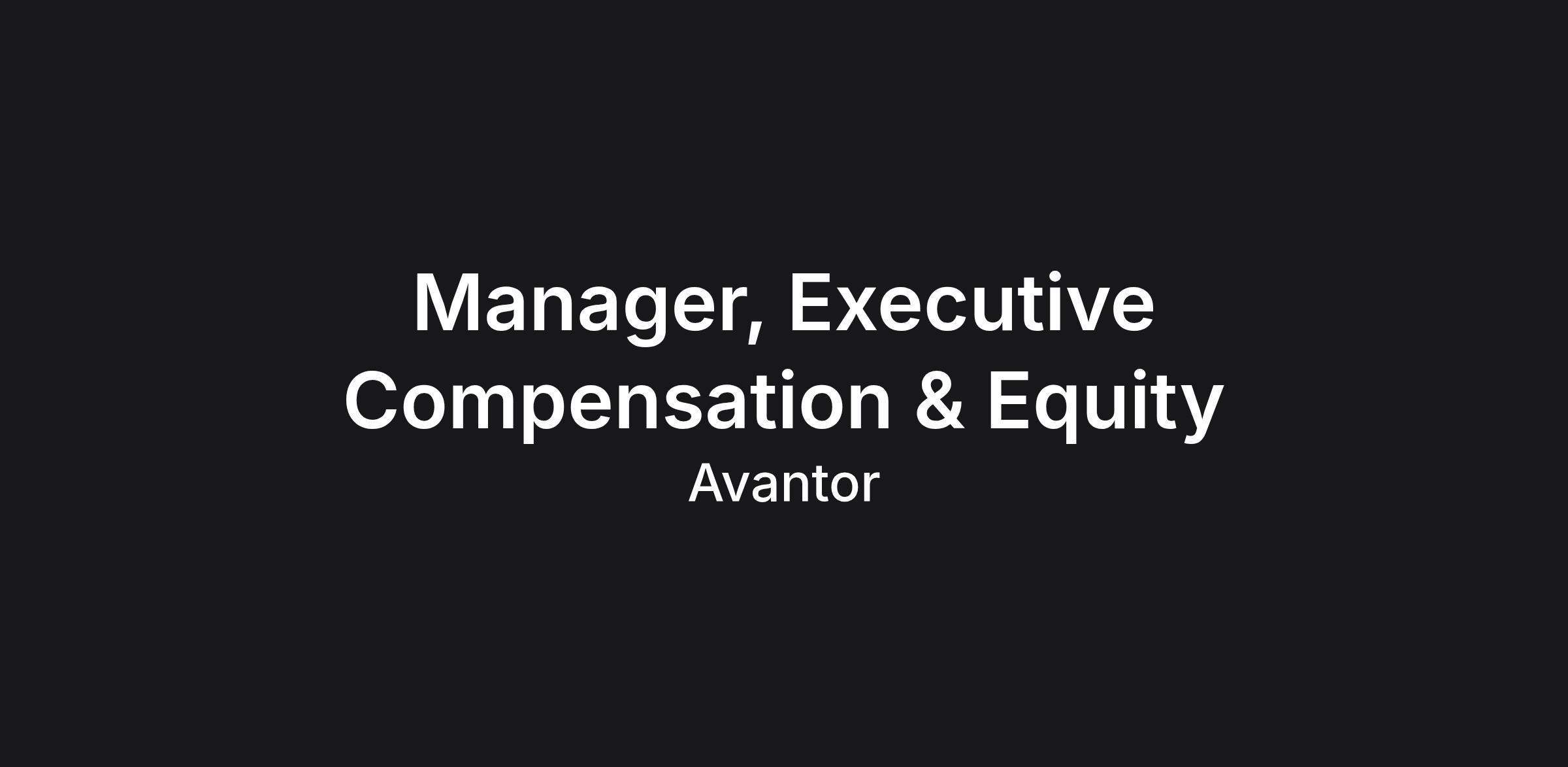 Avantor is looking for a Manager, Executive Compensation & Equity to join our organization. In this role, you will provide analytical and consultative support on executive and equity compensation matters, including pay analyses, policy interpretation, job evaluations, and competitive benchmarking.